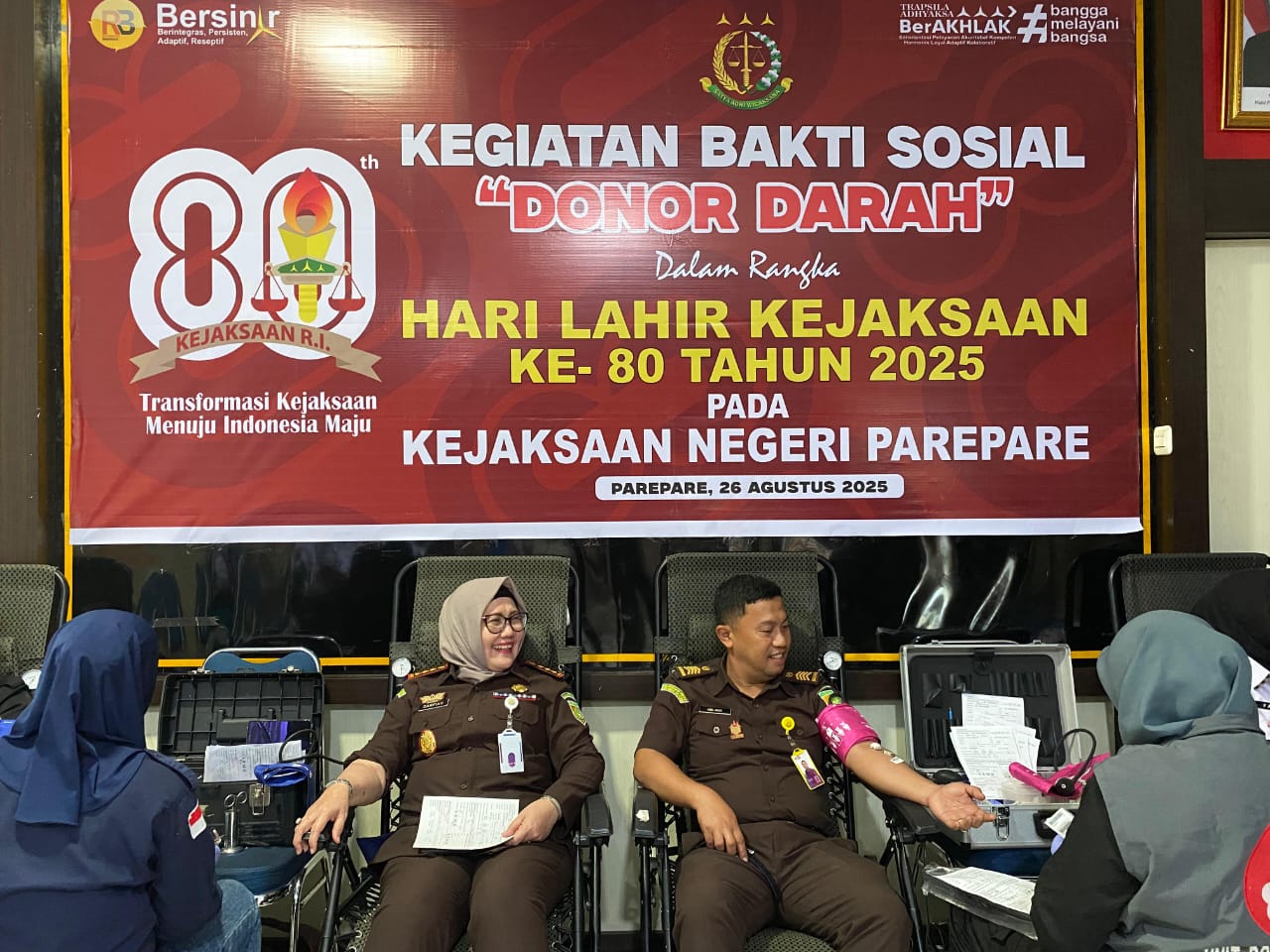 Kepala Kejaksaan Negeri Parepare, Ibu Darfiah S.H., M.H., memimpin langsung jalannya kegiatan. Seluruh jaksa dan staf tata usaha Kejaksaan turut berpartisipasi, berbaris kompak bersama para prajurit TNI untuk mendonorkan darahnya.
