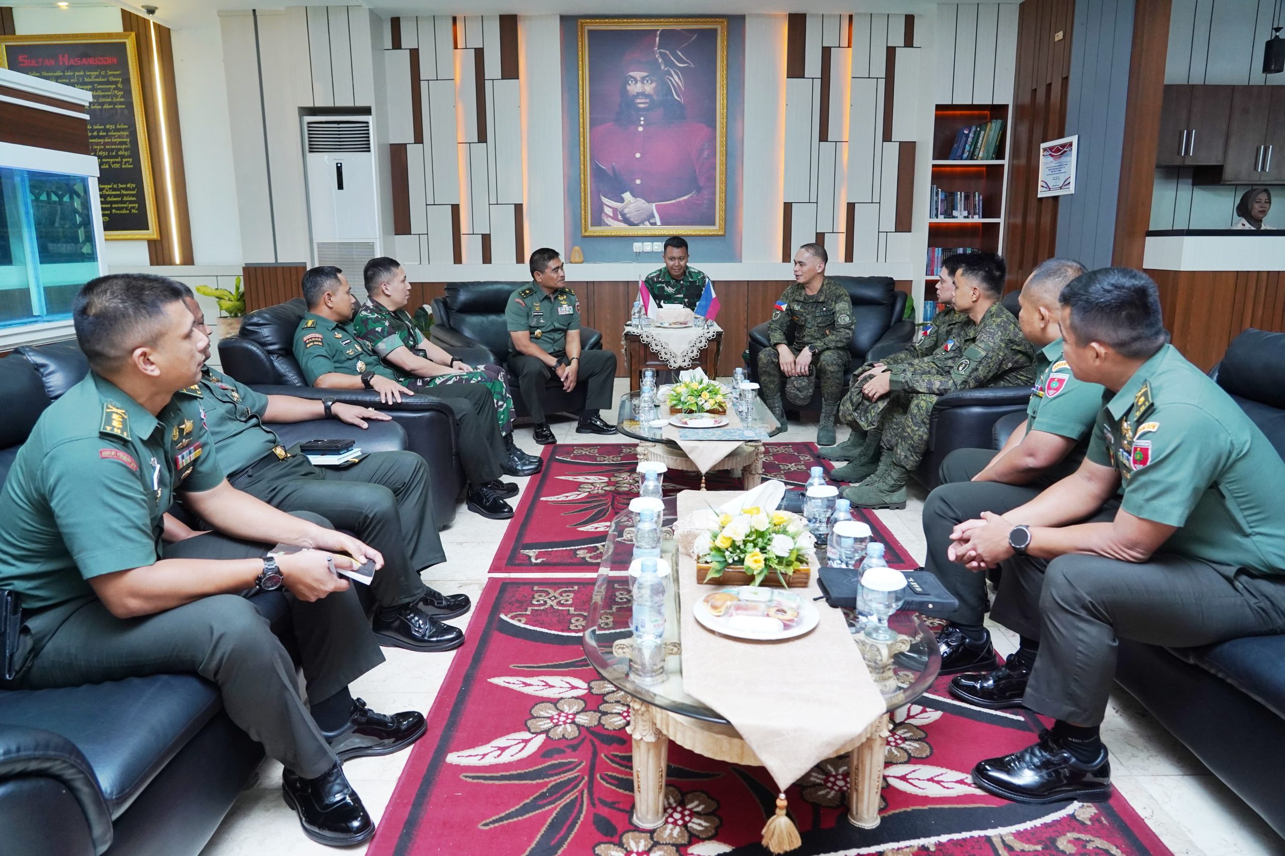 MAKASSAR, SULSEL, Kasdam XIV/Hasanuddin Brigjen TNI Sugeng Hartono, S.E., M.M., menerima kunjungan Tim Senior Officer Visit Programme (SOVP) Philindo Strike V/2025 yang dipimpin Brigadir Jenderal Ricky P. Bunayong beserta prajurit Angkatan Darat Filipina, bertempat di Ruang Kehormatan Makodam, Jl. Urip Sumoharjo, Kota Makassar, Rabu (27/8/2025).