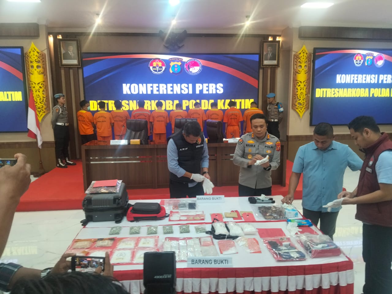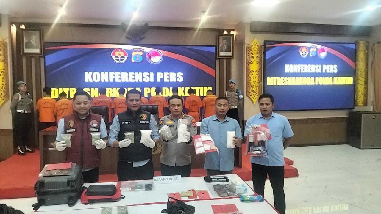 Direktorat Reserse Narkoba Polda Kaltim, Kombes Pol. Arief Bastari Didampingi Kasubbid Penmas Bid Humas Polda Kaltim, AKBP Musliadi Mustafa, menggelar konferensi pers di Gedung Mahakam Polda Kaltim.