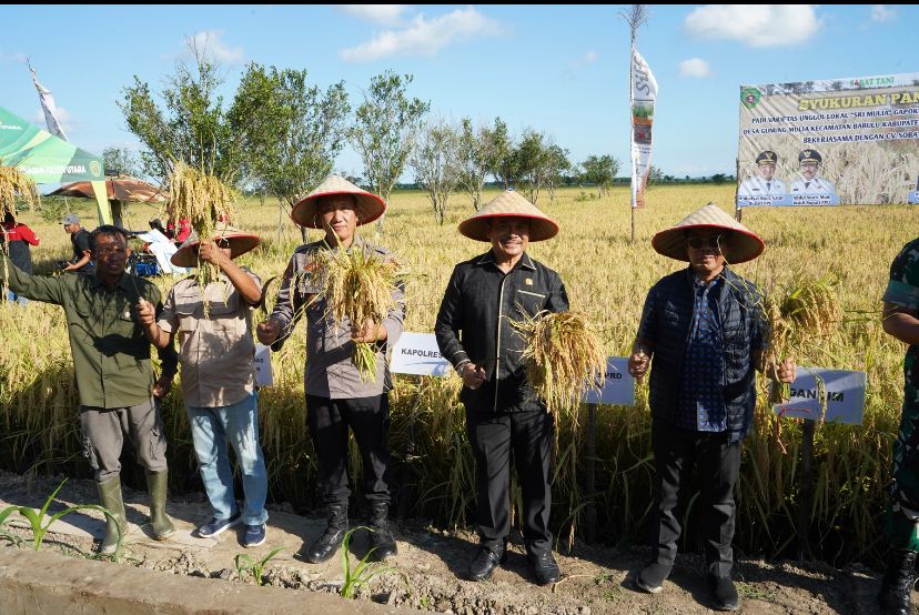 PPU, Hamparan hijau persawahan di Desa Gunung Mulia, Kecamatan Babulu, menjadi saksi syukuran panen padi varietas unggul lokal Sri Mulia, Senin (18/8/2025). Kegiatan yang diprakarsai Gabungan Kelompok Tani (Gapoktan) Karya Tani Mulia bekerja sama dengan CV. Sobat Tani itu berlangsung penuh keakraban dan rasa syukur, dihadiri Bupati Penajam Paser Utara (PPU) H. Mudyat Noor, S.Hut, jajaran Forkopimda, anggota DPRD, hingga perwakilan kelompok tani.