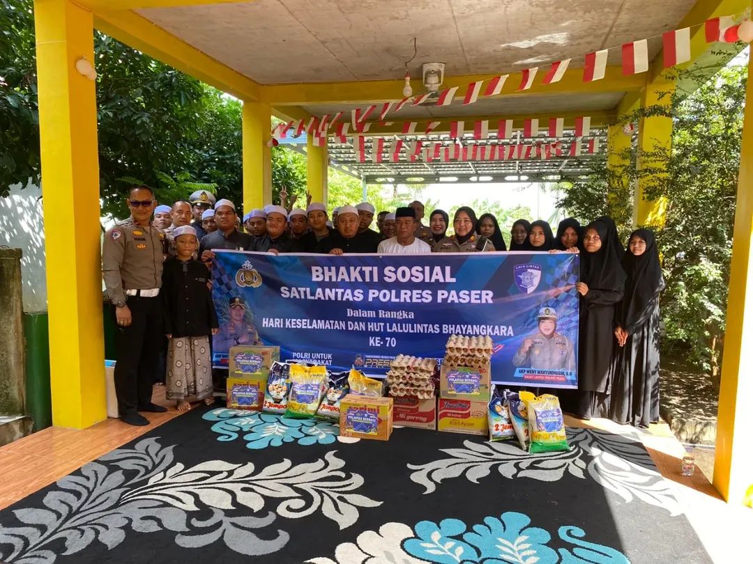 Pada kesempatan tersebut, Satlantas Polres Paser menyerahkan bantuan sosial berupa bahan pokok kepada para santri dan pengurus Rumah Tahfidz Daarut Tauhid. Bantuan yang diberikan meliputi beras, telur, dan mie instan sebagai wujud kepedulian Polri terhadap kesejahteraan masyarakat.