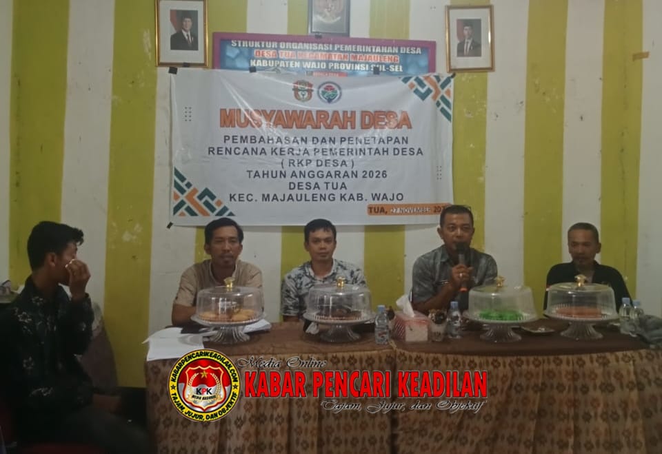 SULSEL,.Musyawarah Desa (Musdes) pembahasan dan penetapan Rencana Kerja Pemerintah Desa (RKPDes) Tahun Anggaran 2026 digelar di Kantor Desa Tua, Kecamatan Majauleng, Kabupaten Wajo, Kamis (27/11/2025). Kegiatan tersebut dihadiri oleh Pemerintah Kecamatan Majauleng, Pemerintah Desa Tua, pendamping desa, Babinsa dan Bhabinkamtibmas, kepala UPTD Puskesmas Tosora, tokoh agama, tokoh pendidikan, serta tokoh masyarakat setempat.