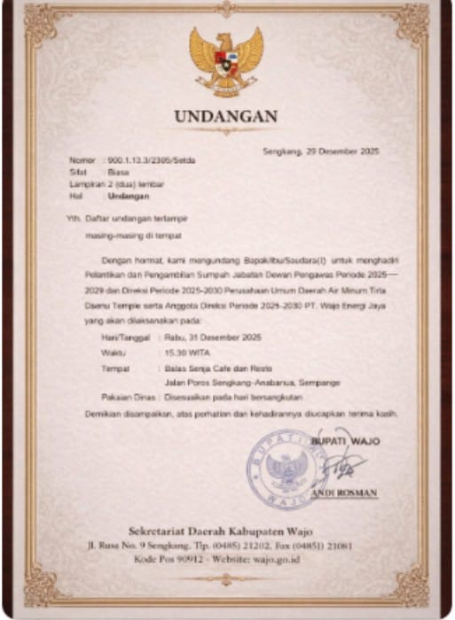 Wajo – Bupati Wajo dijadwalkan melantik dan mengambil sumpah jabatan Dewan Pengawas serta Direktur Badan Usaha Milik Daerah (BUMD) pada Rabu, 31 Desember 2025. Kegiatan tersebut akan berlangsung di Batas Senja Cafe dan Resto, Jalan Poros Sengkang–Anabanua, Sempange.