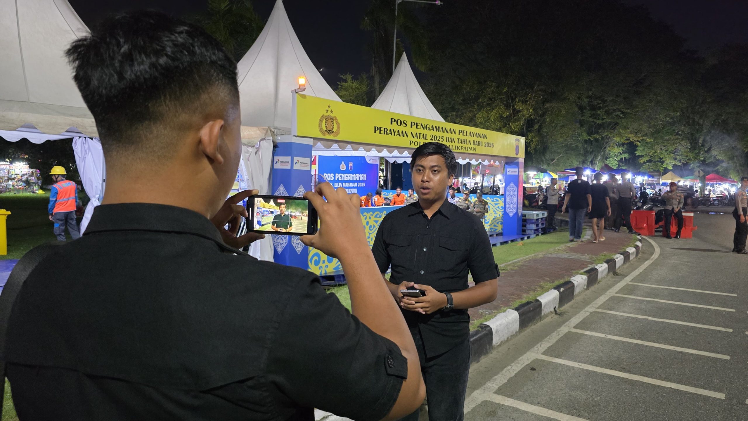 Salah satu titik pelaksanaan live report berada di Lapangan Merdeka Balikpapan, yang sejak sore hari mulai dipadati warga yang ingin menikmati rangkaian acara malam tahun baru. Personel satgas humas memberikan laporan situasi real time mengenai kondisi keramaian, arus lalu lintas, serta keberadaan personel pengamanan yang telah disiagakan.