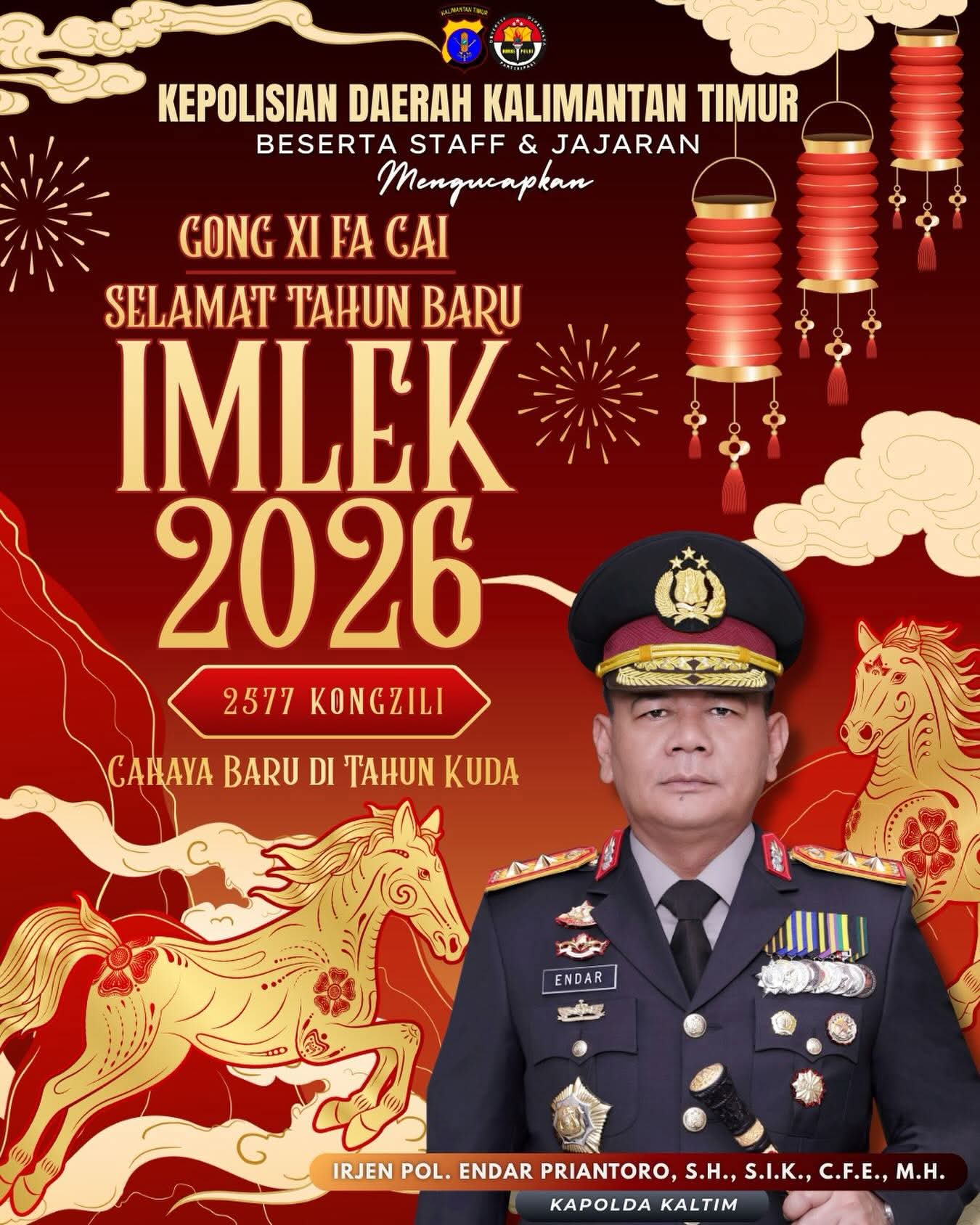 BALIKPAPAN – Kepolisian Daerah Kalimantan Timur beserta staf dan jajaran mengucapkan Selamat Tahun Baru Imlek 2026 kepada masyarakat yang merayakan.