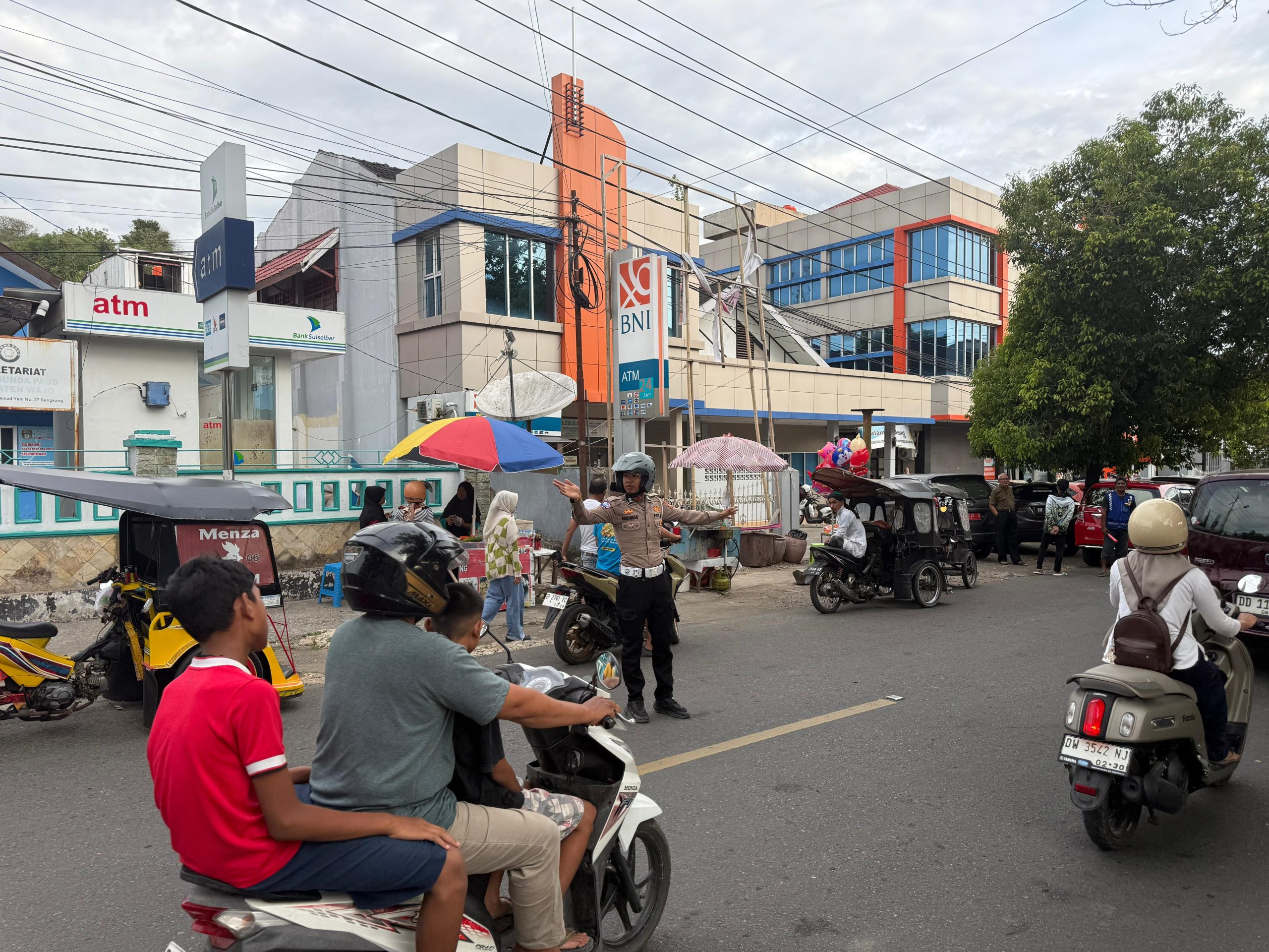 Kawasan ini menjadi salah satu pusat aktivitas masyarakat pada sore hari. Brigpol Fitriani bersama Briptu Aan Hidayat melakukan pengaturan arus sekaligus memberikan imbauan kepada pengendara agar tetap mematuhi rambu lalu lintas dan mengutamakan keselamatan.