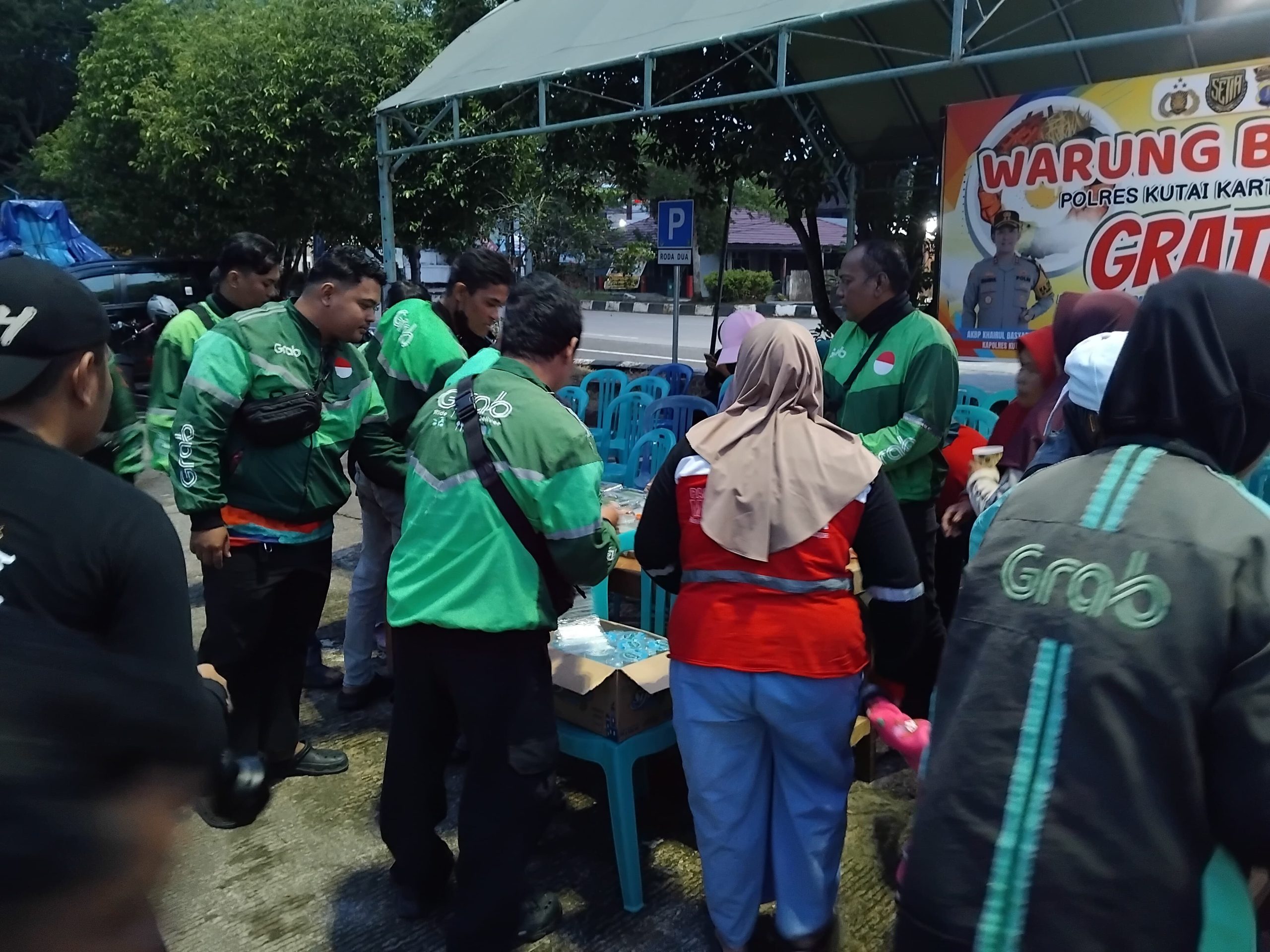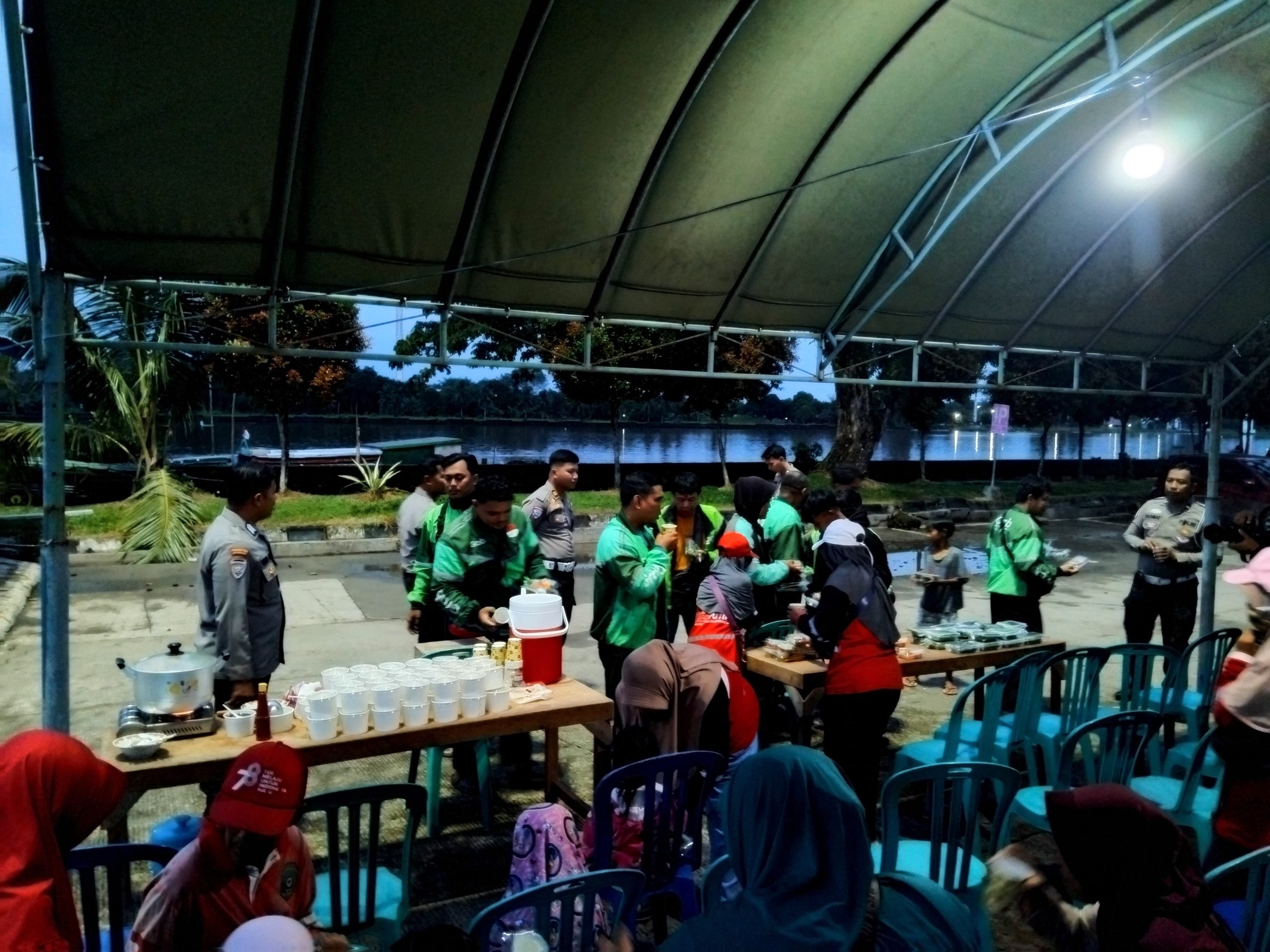 Menjelang waktu berbuka puasa, puluhan pengemudi ojek online, petugas kebersihan, serta warga sekitar memadati lokasi. Personel kepolisian tampak sigap menyambut kedatangan peserta dan menyiapkan hidangan berbuka. Senyum dan sapaan akrab mencairkan suasana, menghadirkan kebersamaan yang sederhana namun berkesan.