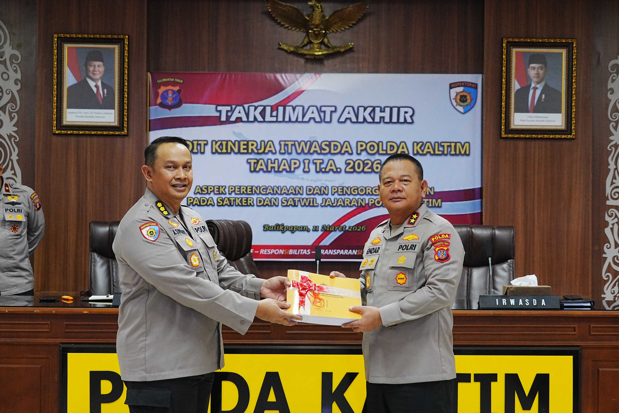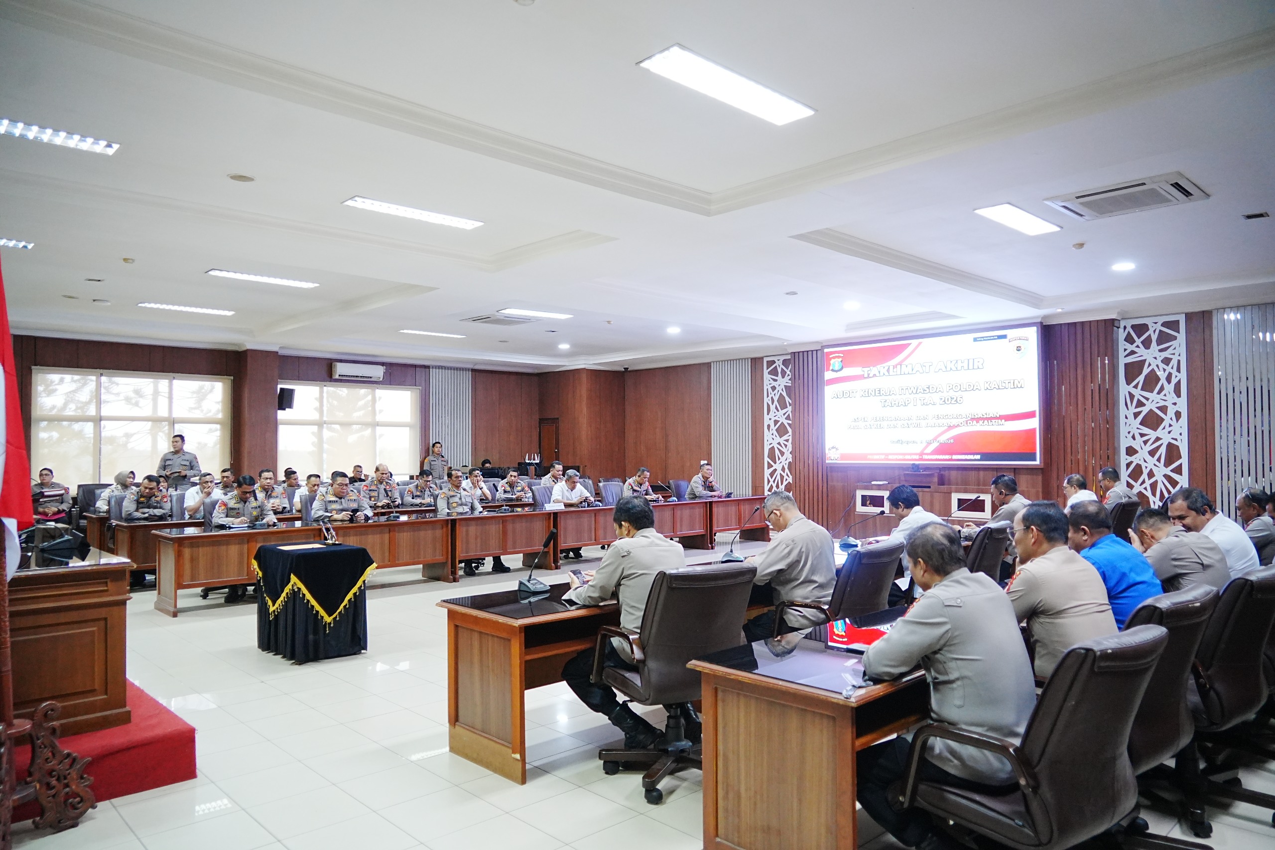 BALIKPAPAN – Kepolisian Daerah Kalimantan Timur menggelar Taklimat Akhir Audit Kinerja Itwasda Polda Kaltim Tahap I Tahun Anggaran 2026 dengan fokus pada aspek perencanaan dan pengorganisasian terhadap seluruh Satuan Kerja (Satker) dan Satuan Wilayah (Satwil) jajaran. Kegiatan tersebut berlangsung di Rupatama Polda Kaltim, Rabu (11/03/2026).
