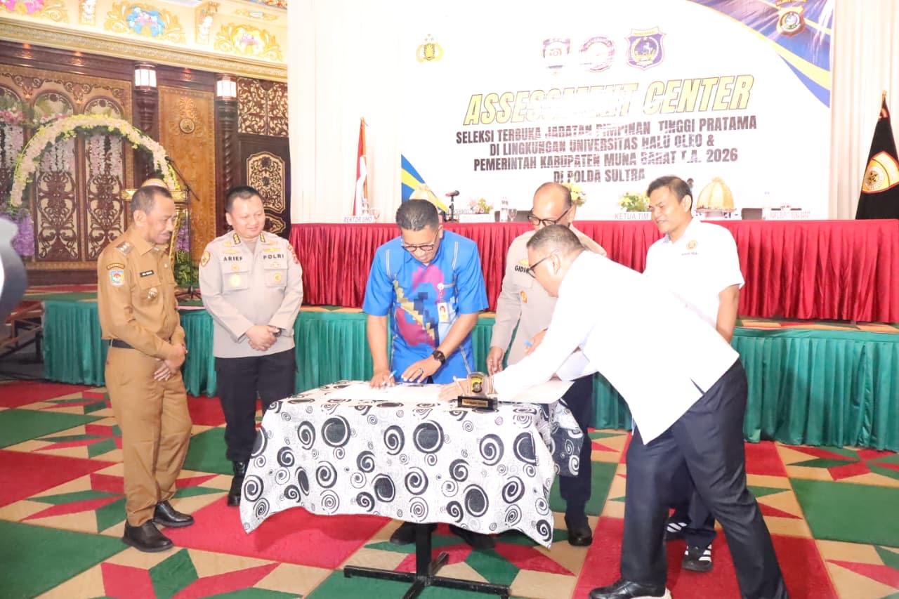 KENDARI – Polda Sulawesi Tenggara melalui Biro Sumber Daya Manusia (SDM) resmi menjalin kerja sama strategis dengan Universitas Halu Oleo (UHO) Kendari dalam pelaksanaan Assessment Center Polri. Penandatanganan kerja sama tersebut berlangsung di Hotel Qubah 9, Kota Kendari, Selasa (31/3/2026) pagi.