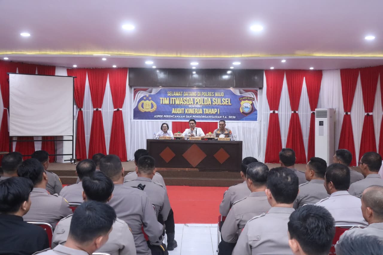 WAJO – Kapolres Wajo AKBP Muhammad Rosid Ridho, S.I.K menerima kunjungan Tim Audit Kinerja Inspektorat Pengawasan Daerah (Itwasda) Polda Sulawesi Selatan dalam rangka Audit Kinerja Tahap I Tahun Anggaran (T.A.) 2026. Kegiatan tersebut berlangsung di Aula Sandi Mapolres Wajo, Rabu (15/4/2026) pukul 09.00 Wita.